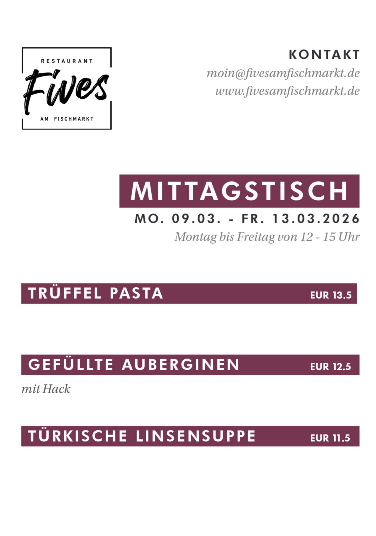 Von Montag bis Freitag bieten wir von 12.00 bis 15.00 Uhr unsere Mittagsgerichte an.