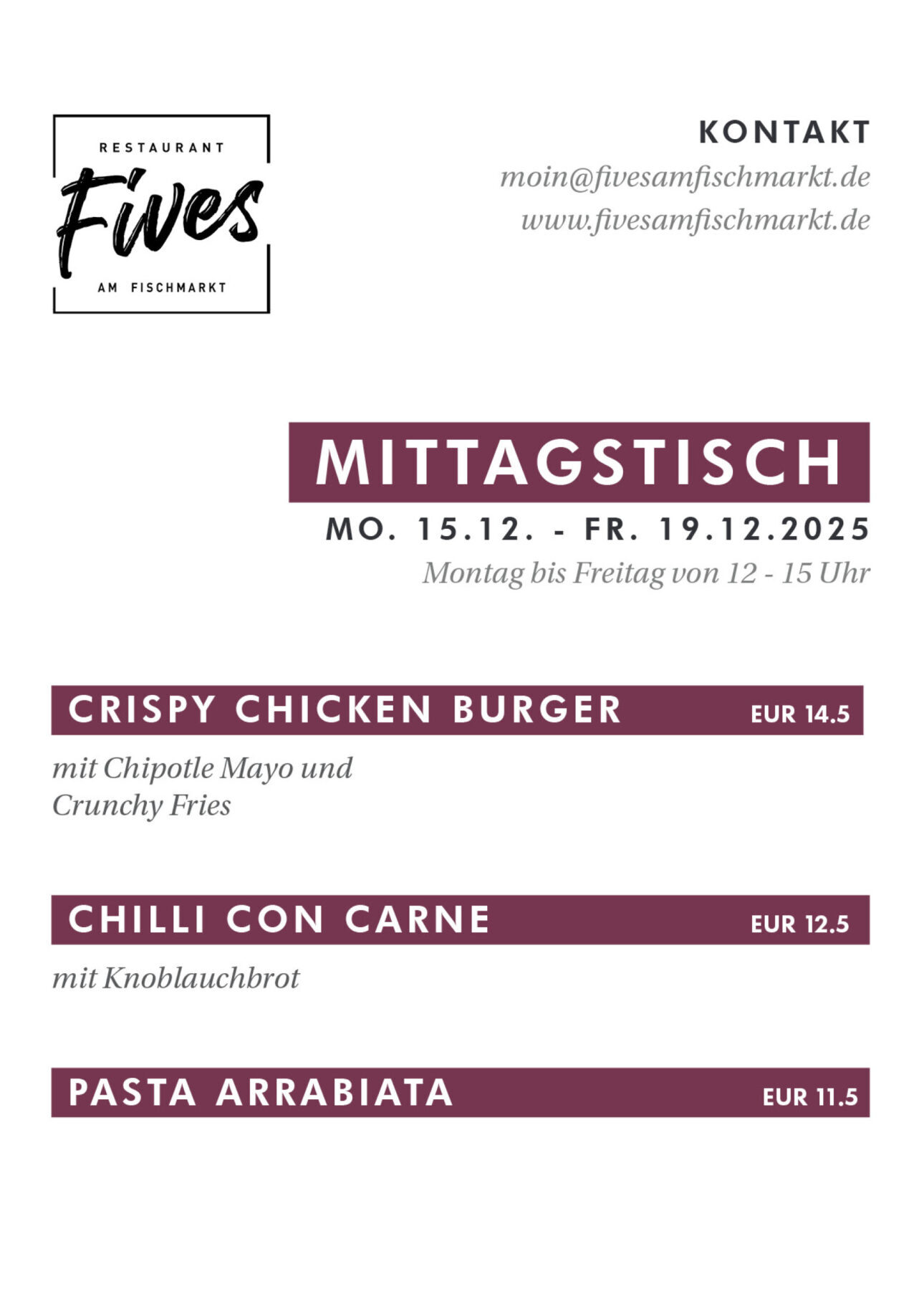 Von Montag bis Freitag bieten wir von 12.00 bis 15.00 Uhr unsere Mittagsgerichte an.