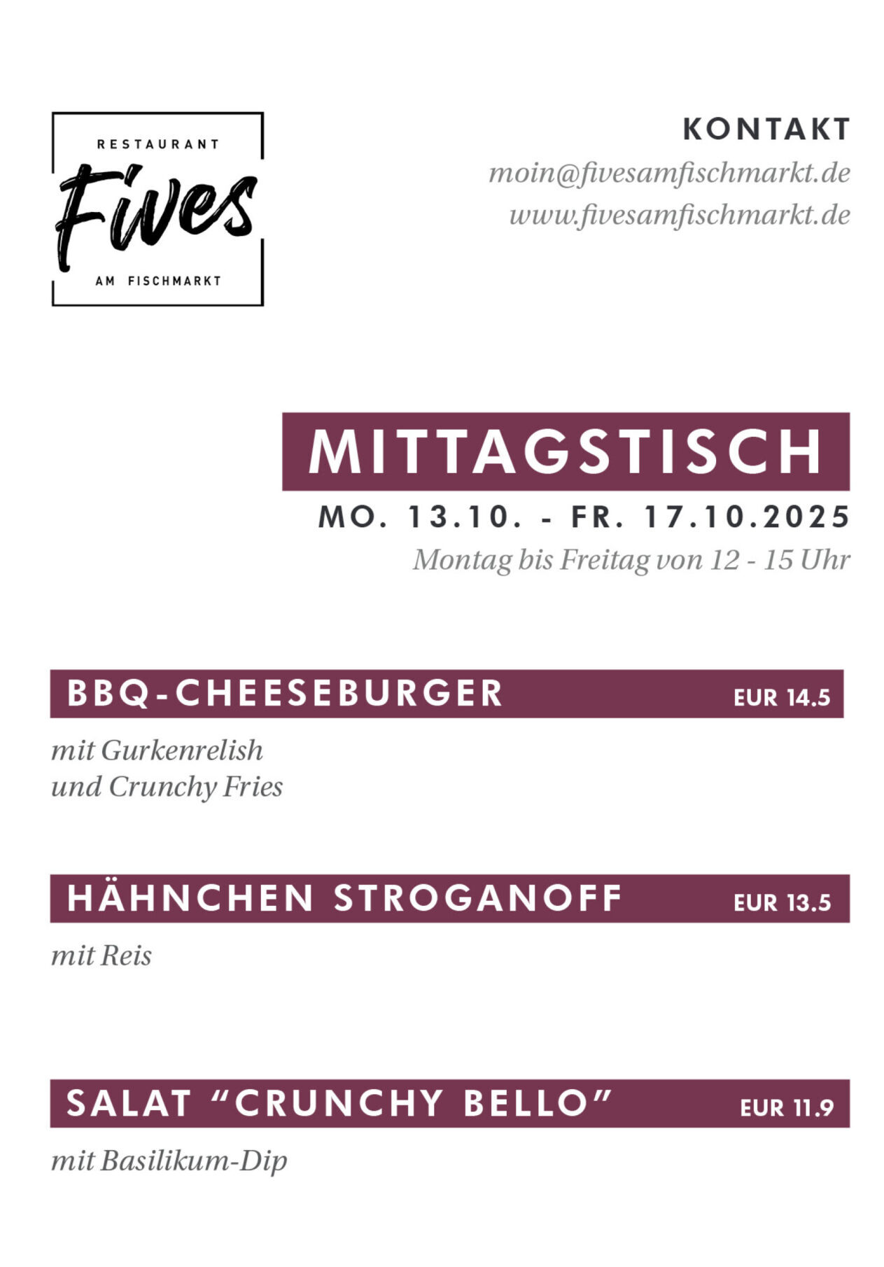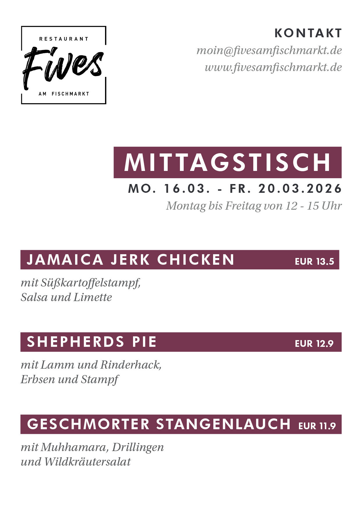 Von Montag bis Freitag bieten wir von 12.00 bis 15.00 Uhr unsere Mittagsgerichte an.